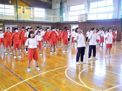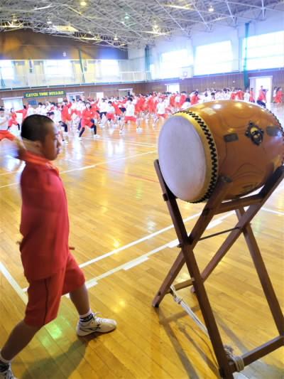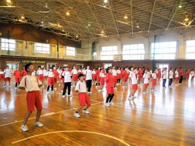 応援団の朝練が、27日の選手激励会を間近に控え、盛り上がっています。一番にやってきた男子生徒は、体育館がまだ開いていないため、外で自主練を始めます。入り口が開くと次々に生徒がやってきて、その数ざっと150人。1・2年生の半分が入団しています。練習が始まると、「押忍」の掛け声と太鼓の「ドン」の大音量が体育館に響き渡り、150人が一斉に体を動かしたり、腕を振ったりするキレのよい音が「シュッ!」「シュッ!」と聞こえてくるようでした。私には、聞こえました。「練習を見るだけで感動してしまう」そんな、応援団の朝練でした。