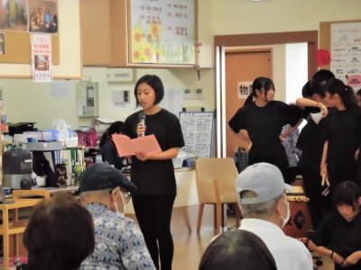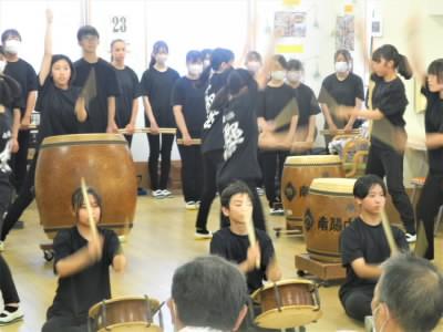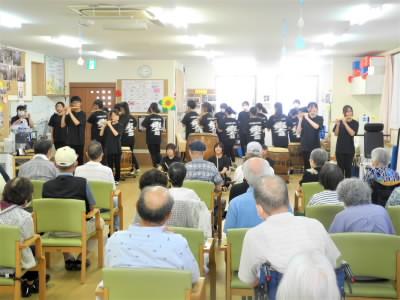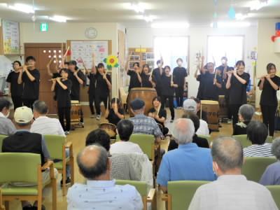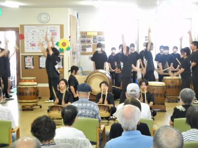 太鼓部が「汐田デイサービスセンター」を訪問し、演奏会を行いました。短い時間でしたが、「暴れ牡牛」「隼」「響」の3曲を披露し、利用者の皆さんを魅了しました。「自分もやりたい!」「感激しました!」「また来てください!」と、演奏を聴いた感想を言ってくださいました。涙を流している方が何人もみえ、こちらも熱いものを感じました。とても素敵な『演奏会』でした。