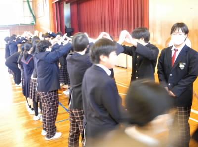 「朝の会の時間に、〇〇さんの壮行会を体育館で行うので、来ていただけませんか」ある学級の級長の突然の申し出でしたが、行ってきました。明日、12月7日(土)愛知駅伝(愛知県市町村対抗駅伝競走大会)「*TV中継あり」に豊橋市の代表として1区を走る予定の生徒と、穂の国とよはし芸術劇場”PLAT”での公演『海に生きる』に出演する生徒の壮行会をサプライズで企画したようです。二人の活躍を願って、学級応援団による演舞、応援歌熱唱、そして、花道をつくって激励しました。練習なし、ぶっつけ本番で臨んだようですが、生徒たちの思いは確実に二人に届いたと思います。とても素敵な壮行会でした。