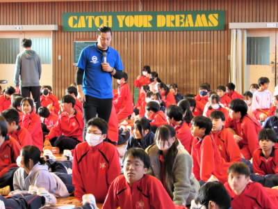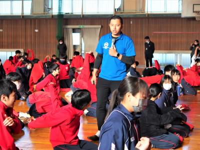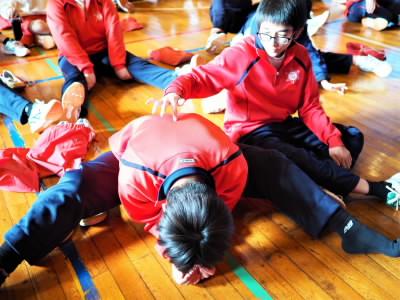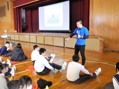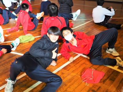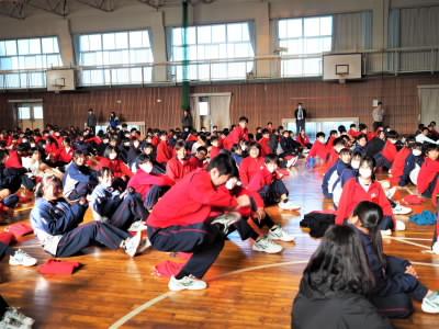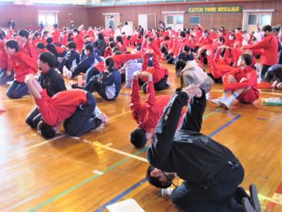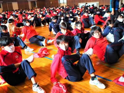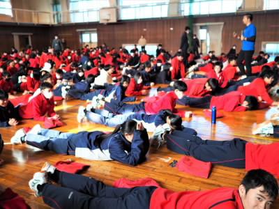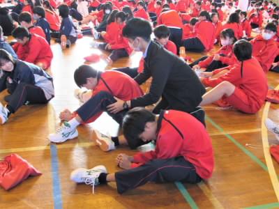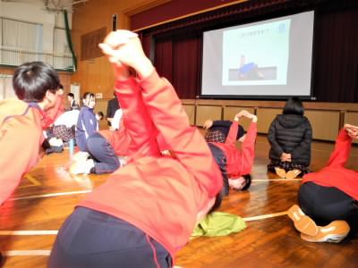 健康運動指導士を講師にお招きし、第3回学校保健委員会『元気いっぱいひなたくんPart3~メディア使用と姿勢の関係について~』を行いました。メディアの長時間使用が身体に与える影響やメディアの適切な使用方法、そして、正しい姿勢について教えていただきました。講師の古田先生の巧みな話術と実際に効果的なストレッチの実演を入れてもらうことで、生徒たちはとても楽しく参加することができました。講演が進むにつれて、生徒たちの姿勢が目に見えてよくなっていったことから、メディア使用と姿勢や生活習慣の関係について意識を高めることができたようです。