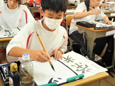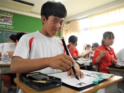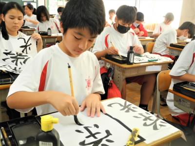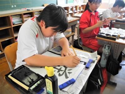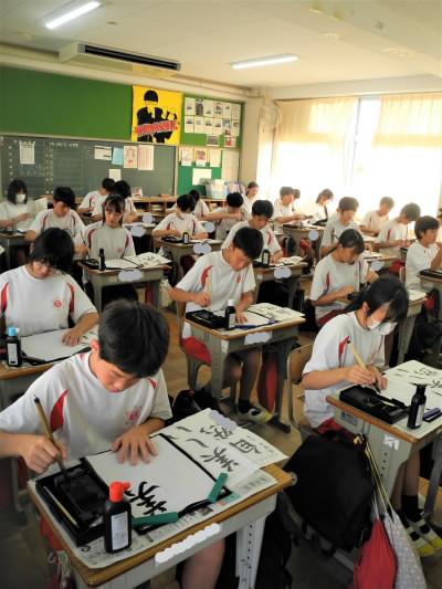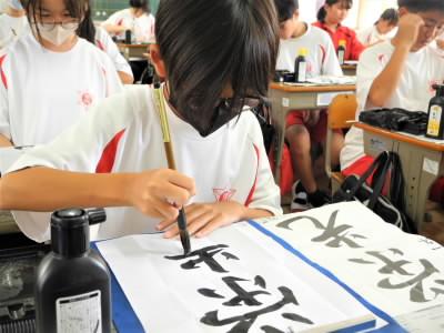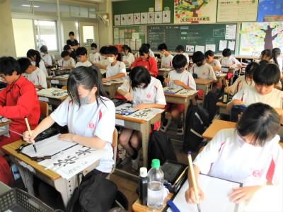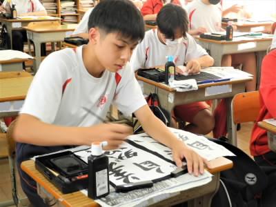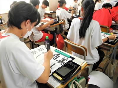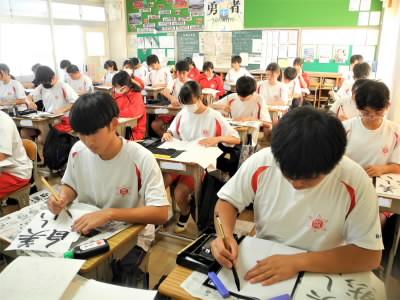6限の南校舎3階は、シーンと静まり返っていました。3年生がそろって『競書会』です。ふだんはとても元気のよい3年生ですが、誰もいないかと思うほどでした。お手本をよく見て、練習したことを確認しながら集中して取り組み、どの生徒も素敵な作品を書き上げていました。1年生もいくつかのクラスが取り組んでいました。3年生に負けないくらいに立派でした。