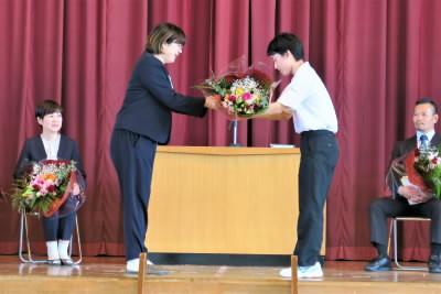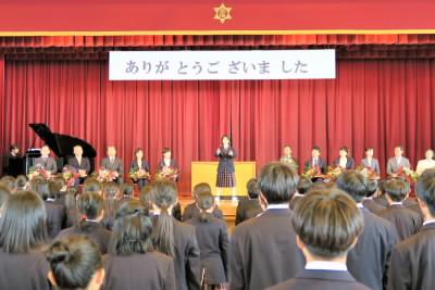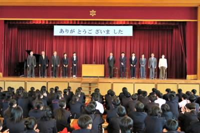 本年度の異動により、南陽中学校を去られた11名の先生方をお迎えして、「退任式」が行われました。はじめに、退任された先生方の活躍を願って、太鼓部が全力の演奏を披露し、その後、お一人お一人から言葉をいただきました。ユーモアあふれる言葉や思いのこもった言葉に、生徒たちも真剣な表情で聴きいっていました。退任された先生方の新たな環境でのご活躍を祈るとともに、次にお会いしたときに、いっそう素晴らしい南陽中学、南陽中生徒になっているように、みんなで取り組んでいこうと感じました。