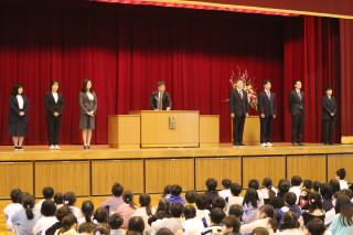 体育館で行われた新任式・始業式では,新しく本校に転任してきた7名の先生が紹介されました。担任発表では,先生の名前が紹介されるたびに大きな拍手があがり,とても温かな雰囲気の中で行われました。