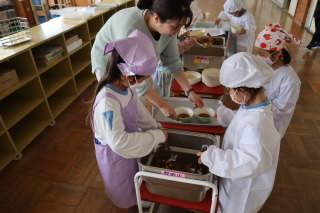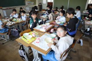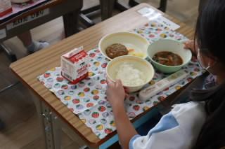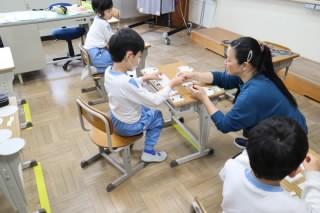 4月16日(火),1年生の給食が始まりました。はじめは給食の配膳に時間がかかることから,他学年より少し早めに準備を始めました。給食当番になった児童は,先生に手伝ってもらいながらエプロンをつけ,配膳室に食缶や牛乳を取りに行きました。その後,それぞれ分担された仕事に取組み,時間内に配膳を完了させることができました。小学校での初めての給食はどうだったでしょうか。これからも楽しく会食ができるといいですね。