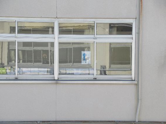 二階の窓に”姿勢シャキットマン”がいました!いつも貼ってあれば、ときどきそちらを見て目を休められそうですね。