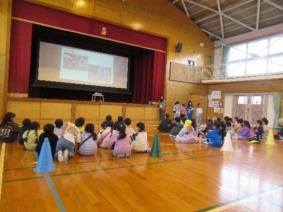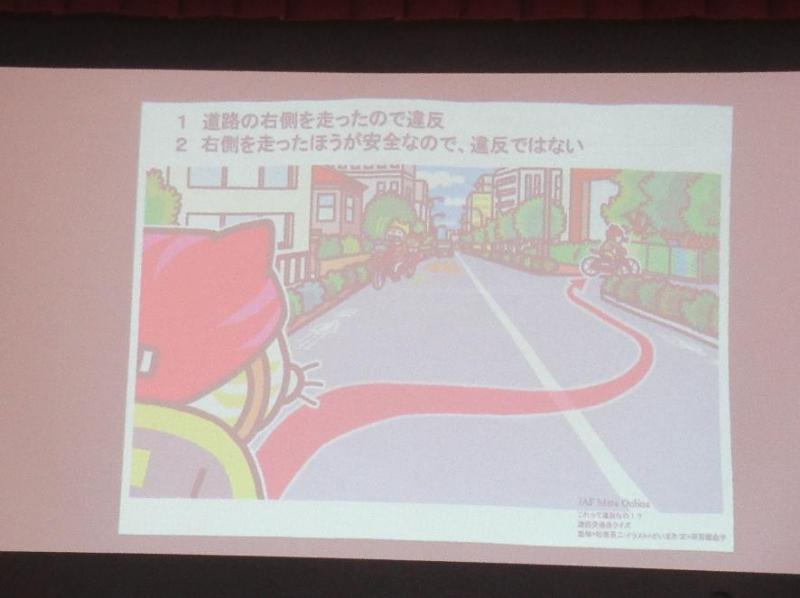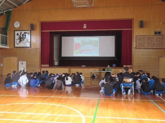 一つ目は自転車教室。5、6年生を対象に開かれました。市の安全生活課の方から、自転車で道路を走行するときの注意点などについてお話をいただきました。