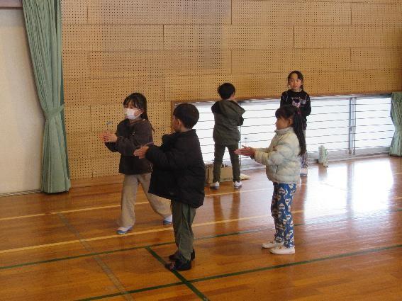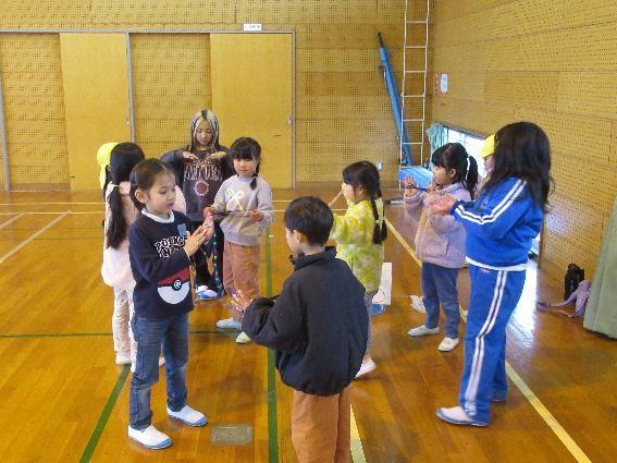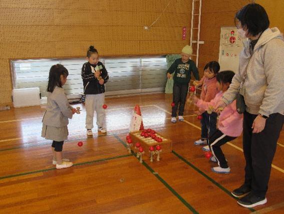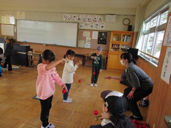 体育館にもどったあとは、いっしょに昔遊びを楽しみました。