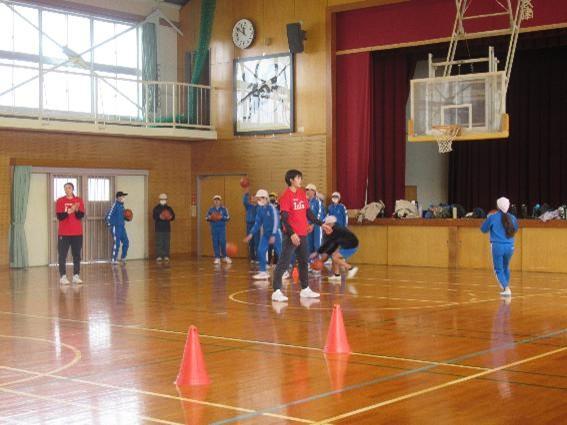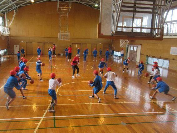 昔遊びと同じ時間帯に、体育館では5、6年生を対象にバスケット教室が開かれました。先生は長く第一線で活躍されてきた、デンソー所属の選手のみなさん。初心者の子どもたちに、バスケを楽しむひとときを提供してくださいました。