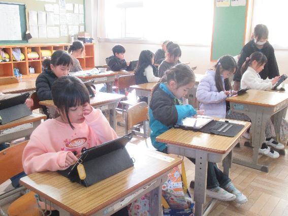 最後の写真は、つい最近1-1教室を通りがかったときに撮ったものです。図工室の活動を終えて戻った子から、タブレットPCを開いて、振り返りを入力していました。先生はまだ図工室からもどっていません。一人一人集中して、振り返りをしていました。