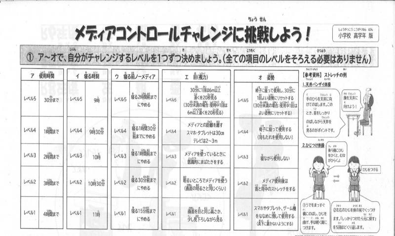 「寝る時間」からゲームをするときの「姿勢」まで、五つの項目について、チャレンジするレベルを自分で設定するところがポイントです。今年度2回目のメディチャレ。以前よりレベルアップをして、自分の生活習慣を整えるきっかけとしてもらいたいものです。