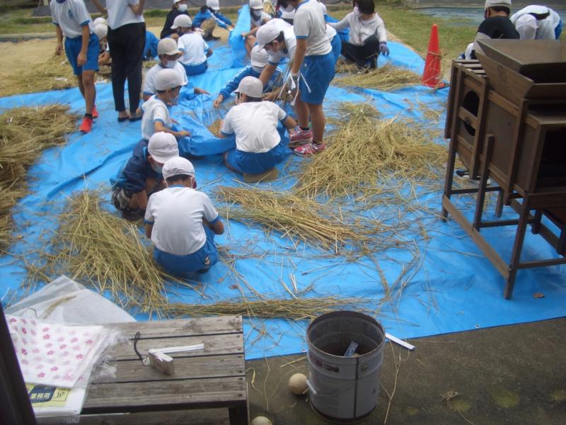 今でこそ機械化された精米作業ですが、昔ながらの脱穀機を社会の授業で学習した児童たちは、当時の人々(農業従事者)の大変さを体験し、自然の恵みと偉大さも感じ取ることができました。