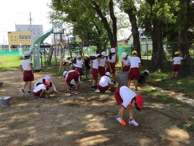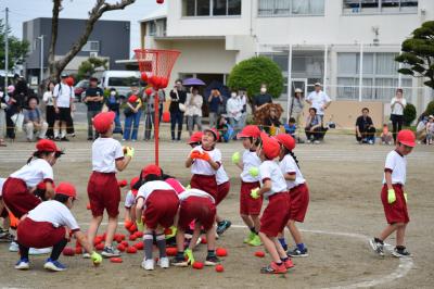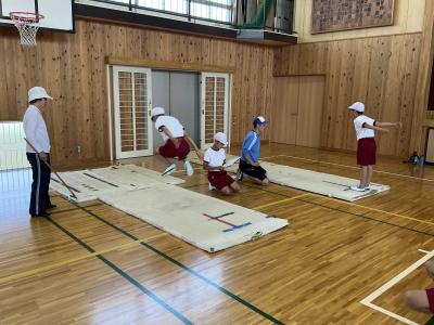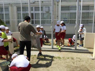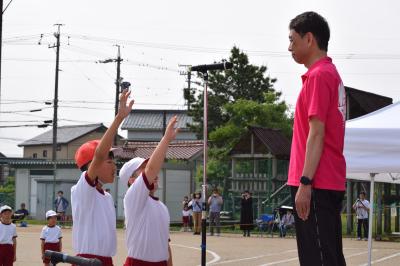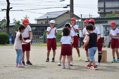 「ここから投げるといいよ」低学年の子にやさしく教える高学年の姿もありました。