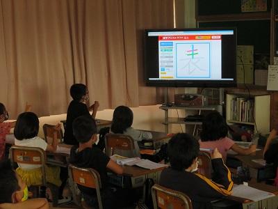 ICTを使った授業です。漢字の筆順がとてもわかりやすく表示されました。子どもたちは、指を使って筆順を確認し、漢字の学習をしました。