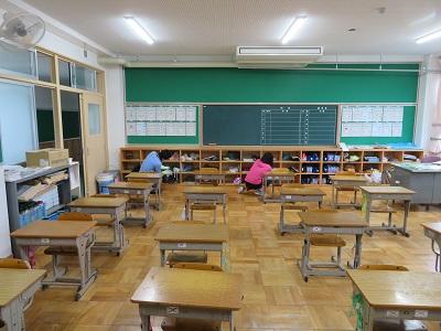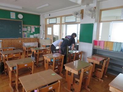 下校後は、先生たちで消毒です。二人一組になり、机やいす、ロッカーなどを消毒しました。