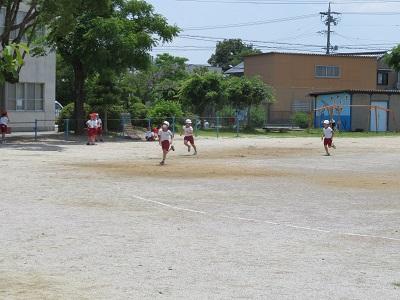 2年生は、運動場で体育です。50m走をしました。最後まで、全力で走りました。