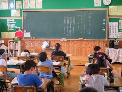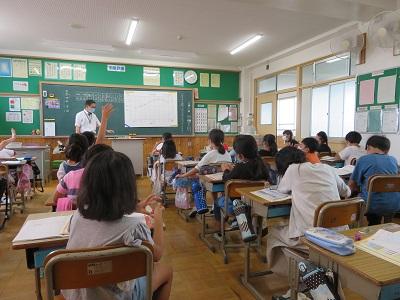 4年生は、算数でした。折れ線グラフの勉強をしていました。折れ線グラフで表すと何が良いか聞かれた4年生。「いろいろ」と答えていましたが、徐々に具体的な考えが出てきました。「変化がわかる」「変化の大きさがわかる」等を発言していました。いい勉強をしていますね。