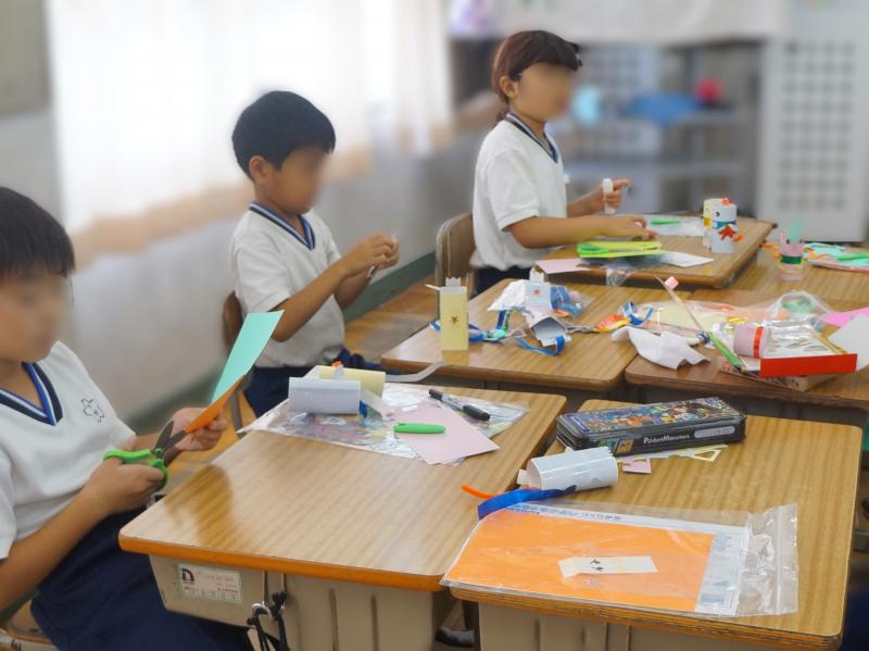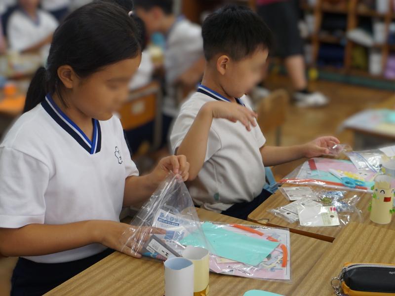 図工の学習では、紙やモールを使って、なかよしの二人組を作りました。