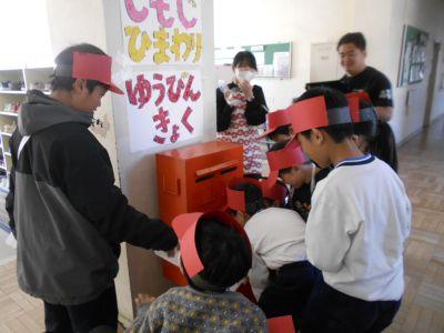 ひまわり組が郵便局を開設しました。この写真は、昇降口に設置したボストからお手紙を回収しているところです。