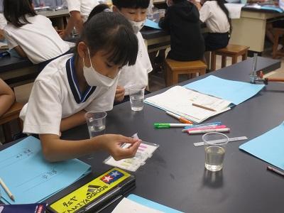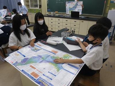 社会や総合的な学習で、川について学習しています。この日は出前授業があり、豊橋市建設部河川課の職員の方から川の役割や水の汚れ具合などを教えていただきました。パックテストをやったりハザードマップを広げたりして、とよがわの水質や防災に対する理解を深めることができました。