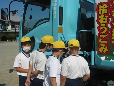 下地小学校に、青緑色の大きなトラックが入ってきました!ごみ収集車です!!この日は、4年生の出前授業の日でした。職員の方に説明していただき、ごみについての理解を深めました。