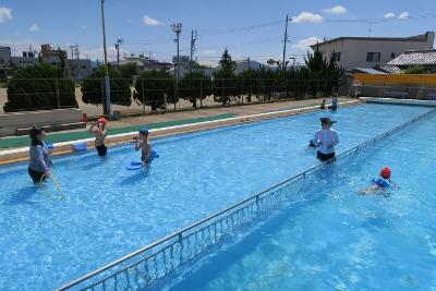 夏休みに入り,学校のプールで指導も始まりました。今日は久しぶりの晴天に恵まれ,下地っ子たちも元気に泳ぎました。
