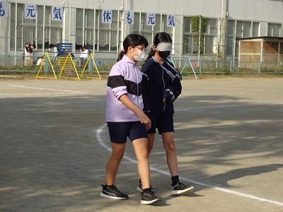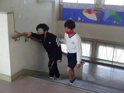 アイマスク体験をしました。子どもたちは、目が不自由な人にとって危ないところや、自分にできることを考えながら、友だちと校内を歩きました。