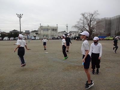 体育で、なわとびの練習をしました。距離跳びや時間跳びなど、自分の目標をもって一生懸命取り組んでいました。