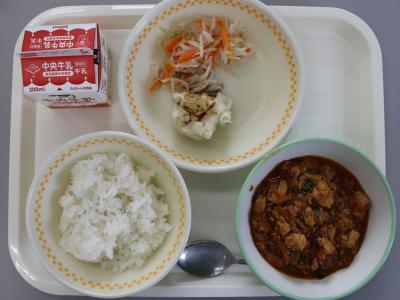 今日の給食は、ごはん、牛乳、すりみ入りコーンしゅうまい、ゆでやさい、マーボー豆腐です。マーボー豆腐は給食でとても人気のあるメニューの1つです。給食のマーボー豆腐には、赤みそやしょうゆのほかに、かくし味にケチャップやトウバンジャンが入ることで、うま味と辛みが増しておいしくなります。