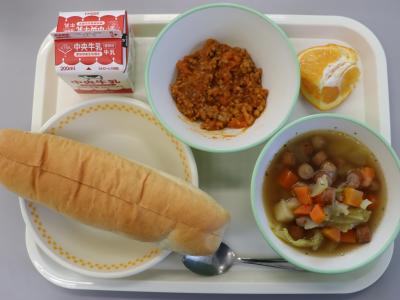 今日の給食は、サンドイッチロール、牛乳、スラッピージョー、やさいスープ、いよかんです。スラッピージョーとは、パンにミートソースのような具をはさんで食べるアメリカで生まれた料理です。ジョーさんという名前のシェフが考えたとされることから、この名前がついたといわれています。アメリカの子どもたちに大人気のメニューです。パンに具をはさんで食べましょう。