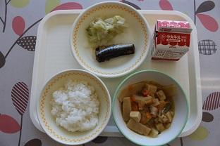今日 の給食 は、ごはん、牛乳 、いわしのしょうが煮 、そえやさい、やさいの炊 き合 せです。いわしのしょうが煮 には、骨 や歯 をつくってくれるカルシウムが多 く含 まれています。カルシウムは、やさいの炊 き合 せの中 に入 っている高野豆腐 にも多 く含 まれています。高野豆腐 は、大豆 から作 る豆腐 を乾燥 させたものです。