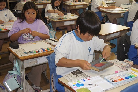 5年生の国語の授業を、他校から来たたくさんの先生が参観しました。本校の教員も研修の一環としてこれに加わり、「体験的な要素を取り入れた楽しくわかる・できる授業づくり」について学びあいました。