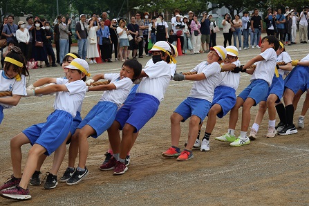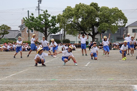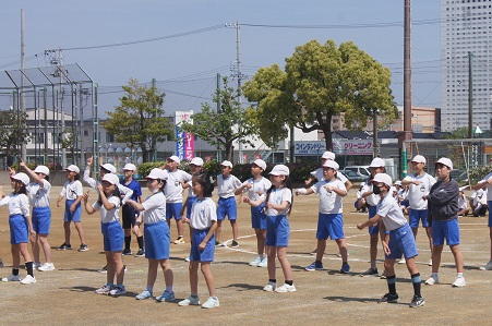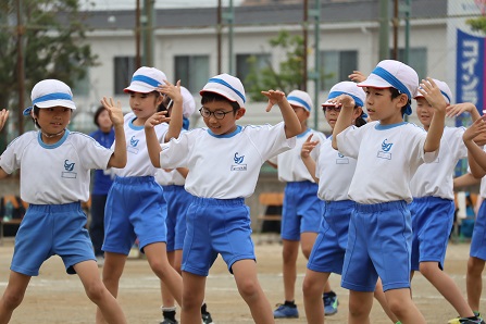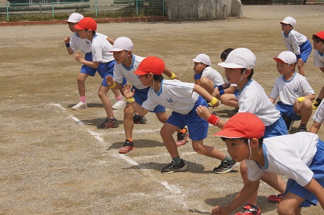 学校中の子どもたちと先生が、心地よい汗を流しています