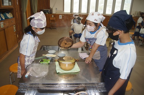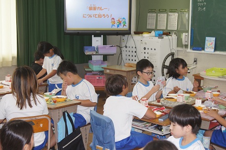 また、今日の給食には、備蓄カレーが出ました。1年に1度出るか出ないかのメニューに、子どもたちは興味津々。でも、おいしそうでしたよ。
