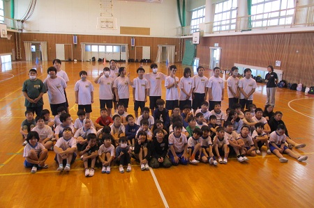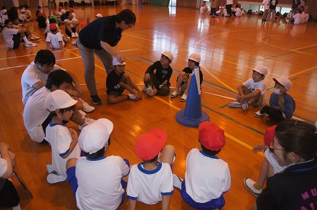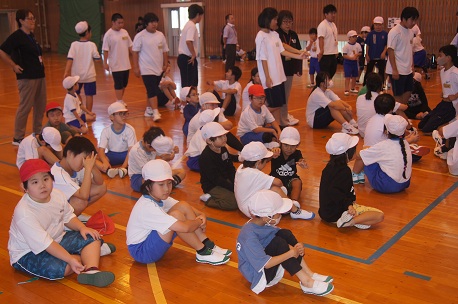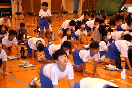 学校中の子どもたちと先生が、心地よい汗を流しています