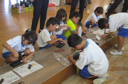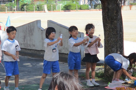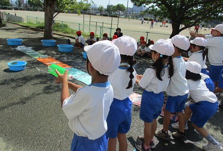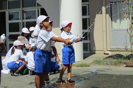 今も昔もやはり水遊び、それも水鉄砲の魅力は抜群です。1年生の生活科で題材として取り上げ、アイデアを生かして遊びをつくりだす体験に浸らせているようです。