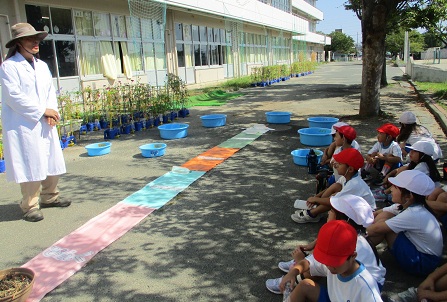 「ピンクかわいいね!」「もう少し水を入れたほうがいいんじゃない?」「先生、見てみて!」