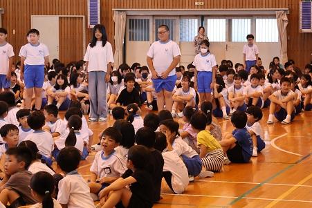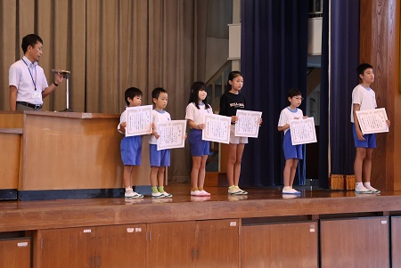これまで昼休みに開いていた月1回の集会を朝の時間に移してみました。今日は、表彰、2学期学級代表任命、校長先生の話、今月のめあての発表がありました。1時間目に食い込まないように済まないのが悩みの種です、、、、。