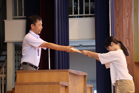 6年生の代表の子に任命証が渡されます。「よろしくお願いします」