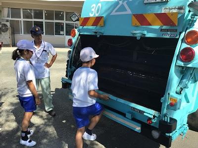 ごみ収集車に燃やすごみを入れる体験や,操作体験もさせていただきました。