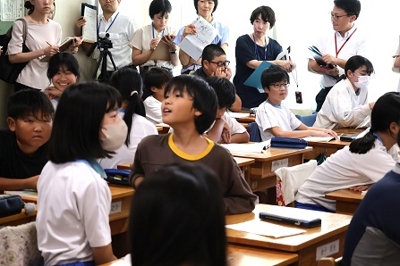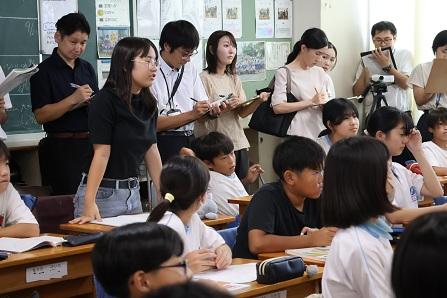 5年生の国語の授業を、他校から来たたくさんの先生が参観しました。本校の教員も研修の一環としてこれに加わり、「体験的な要素を取り入れた楽しくわかる・できる授業づくり」について学びあいました。