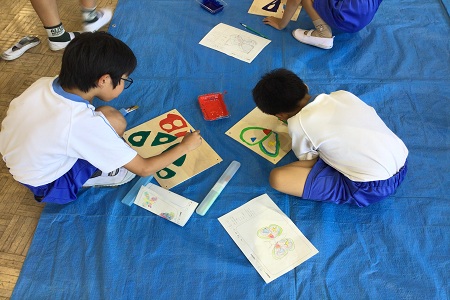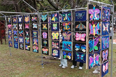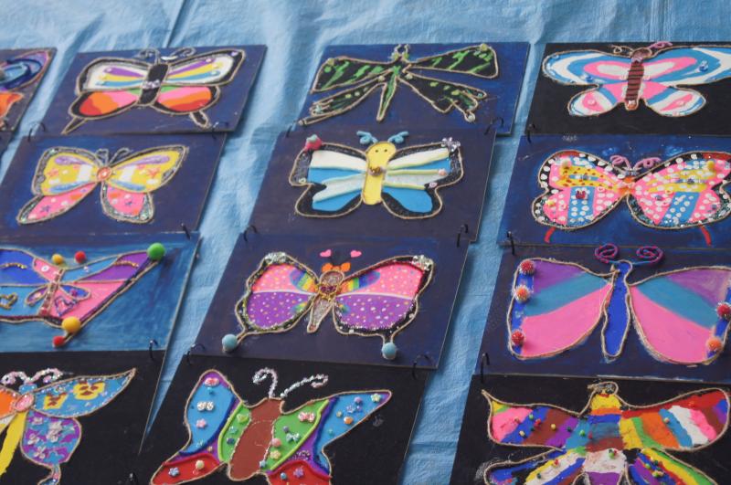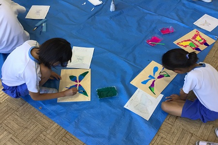 図工の作品づくりに夢中な4年生。アクリル絵の具やビーズなどの材料を使って、オリジナルの蝶を作っています。今日は下書きに絵の具で色をつけました。