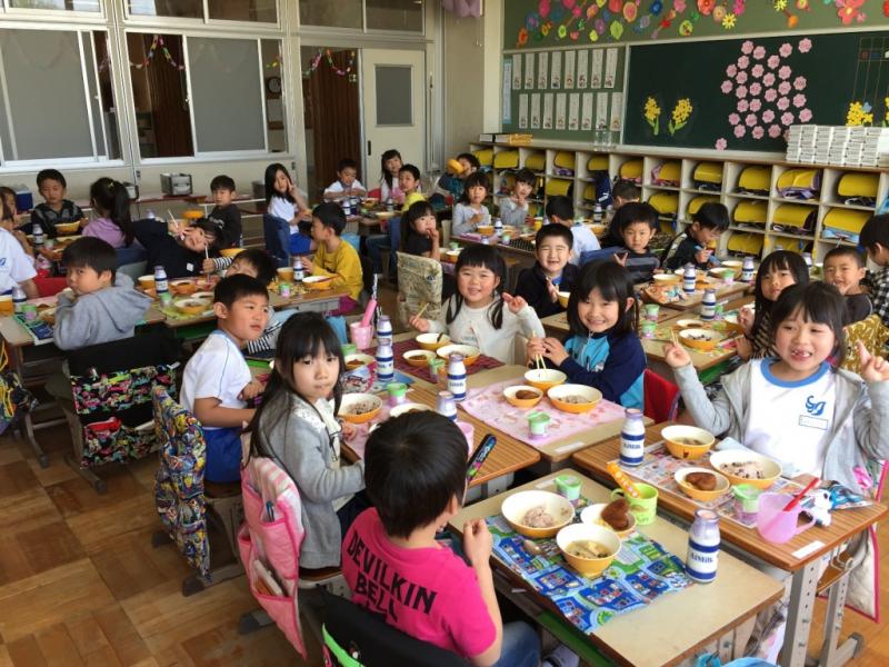 今日から1年生の給食が始まりました。初めはちょっと多いかもしれませんが、みんな楽しそうに給食を食べることができました。たくさん食べて、元気モリモリの汐田っ子になってほしいですね。