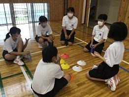 音楽に合わせて体育館をランダムに歩き回り、音楽が止まった時に近くのカラーコーンに集まり、グループで座ります。