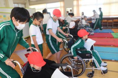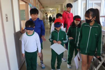 手話や筆談,アイマスクをしての歩行や補助,車いすを体験ができるようブースを作って,全校児童が体験しました。