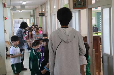 担任の先導で学校探検。1年生の子は,初めて入る教室やそこにあるものに興味津々で,