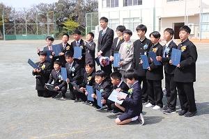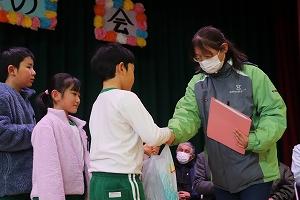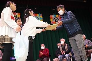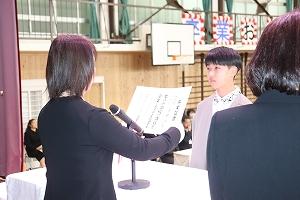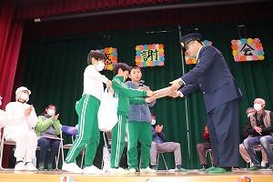 朝礼の中で,先月に行った校内競書大会や夏休みに取り組んだ作品で優秀な成績を収めた子の表彰を行いました。