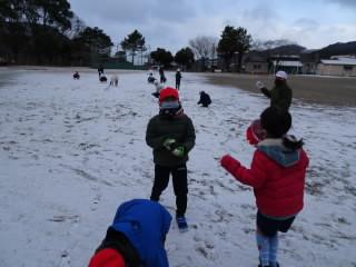 1月14日(金) 子どもたちが登校し始める頃から雪が降り、運動場に積もりました。1,2年生が運動場に出て積もった雪で遊びました。とても楽しそうでした。