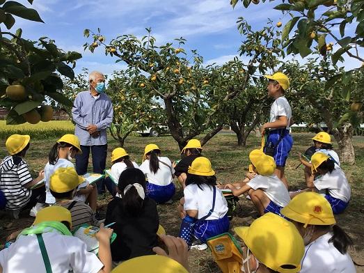 秋風吹く中,3年生が柿畑へ。