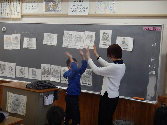 先生と一緒に,元気に英語で話します。