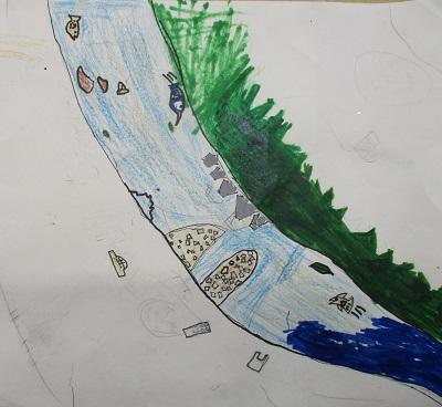 次は,調査をしているときの絵です。水質検査や水生生物調査をしました。その結果,「きれいな川」であるということがわかり,とても驚きました。きれいな水なのに,魚が少ないのはなぜだろうと思い,上流の嵩山川に調査に行きました。嵩山川は,とてもきれいで遊べる川でした。